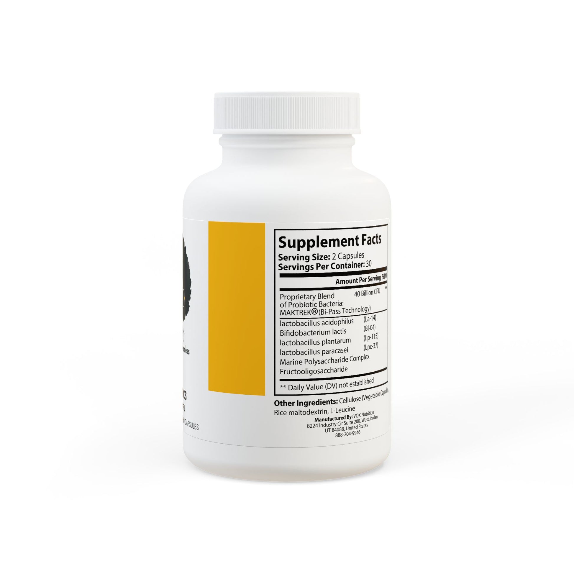 Key ingredients include a Proprietary Blend of Probiotic Bacteria with MAKTREK® (Bi-Pass Technology), Lactobacillus acidophilus, Bifidobacterium lactis, Lactobacillus plantarum, Lactobacillus paracasei, Marine Polysaccharide Complex, and Fructooligosaccharide® (FOS).