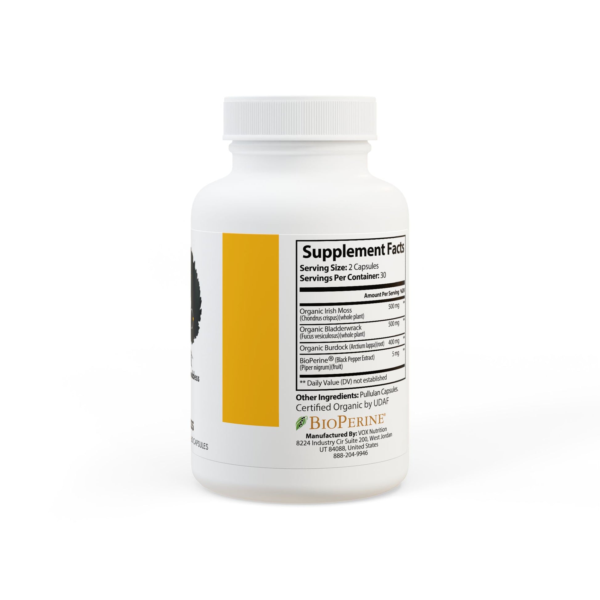 Ingredients: Organic Irish Moss (Chondrus crispus)(whole plant), Organic Burdock (Arctium lappa)(root), Organic Bladderwrack (Fucus vesiculosus)(whole plant), BioPerine® (Black Pepper Extract), (Piper nigrum)(fruit). Other Ingredients: Pullulan Capsules.